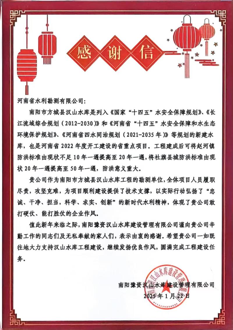 近日,公司陸續收到新鄉市“四縣一區”南水北調配套工程東線項目、漢山水庫、大別山革命老區(潢川)現代水網等多家單位向公司發來感謝信。信中對公司承擔的南水北調配套工程東線項目、漢山水庫工程、潢川現代水網建設暨項目有序推進表示衷心的感謝,對公司派出的專業技術團隊所展現的良好作風及業務素養給予肯定。
